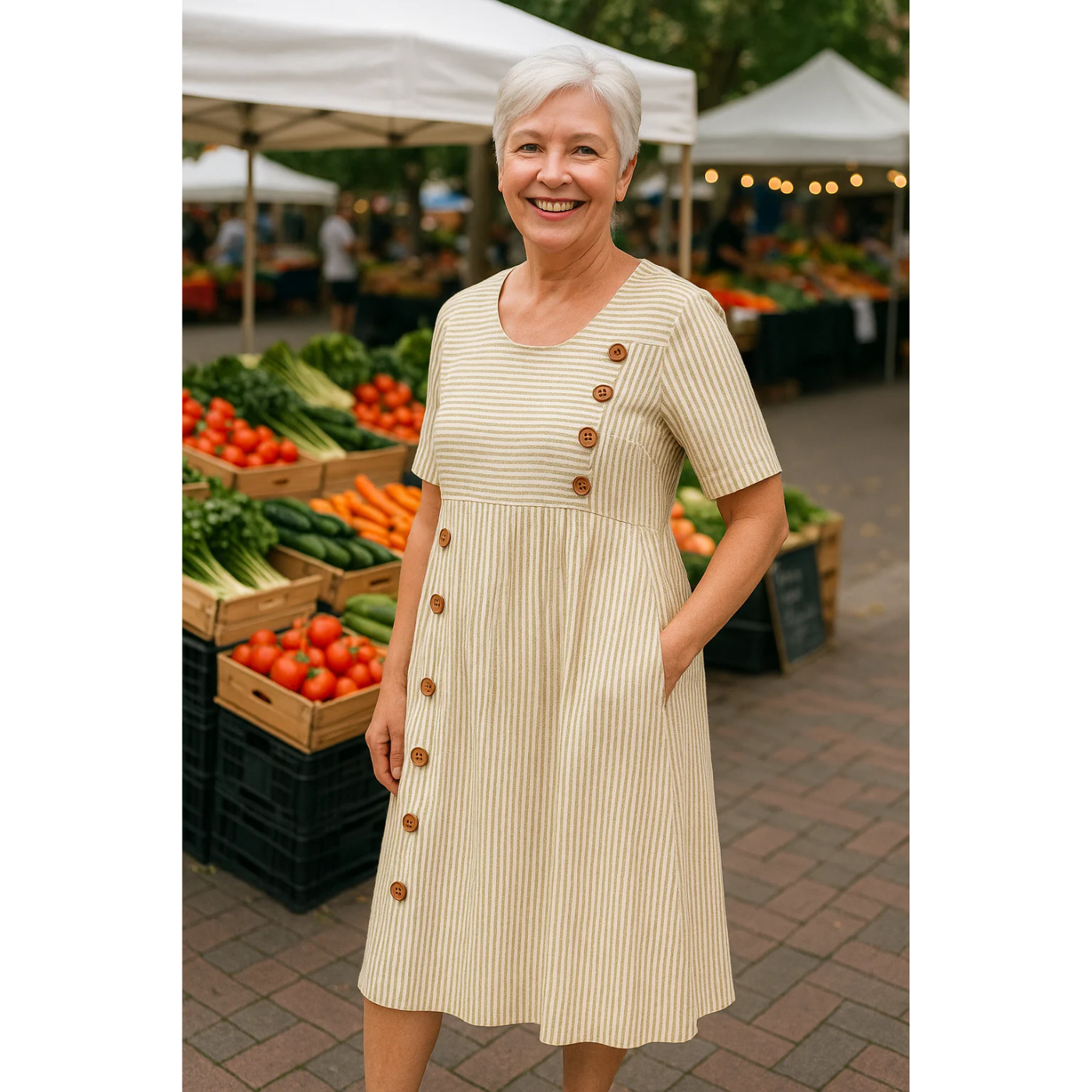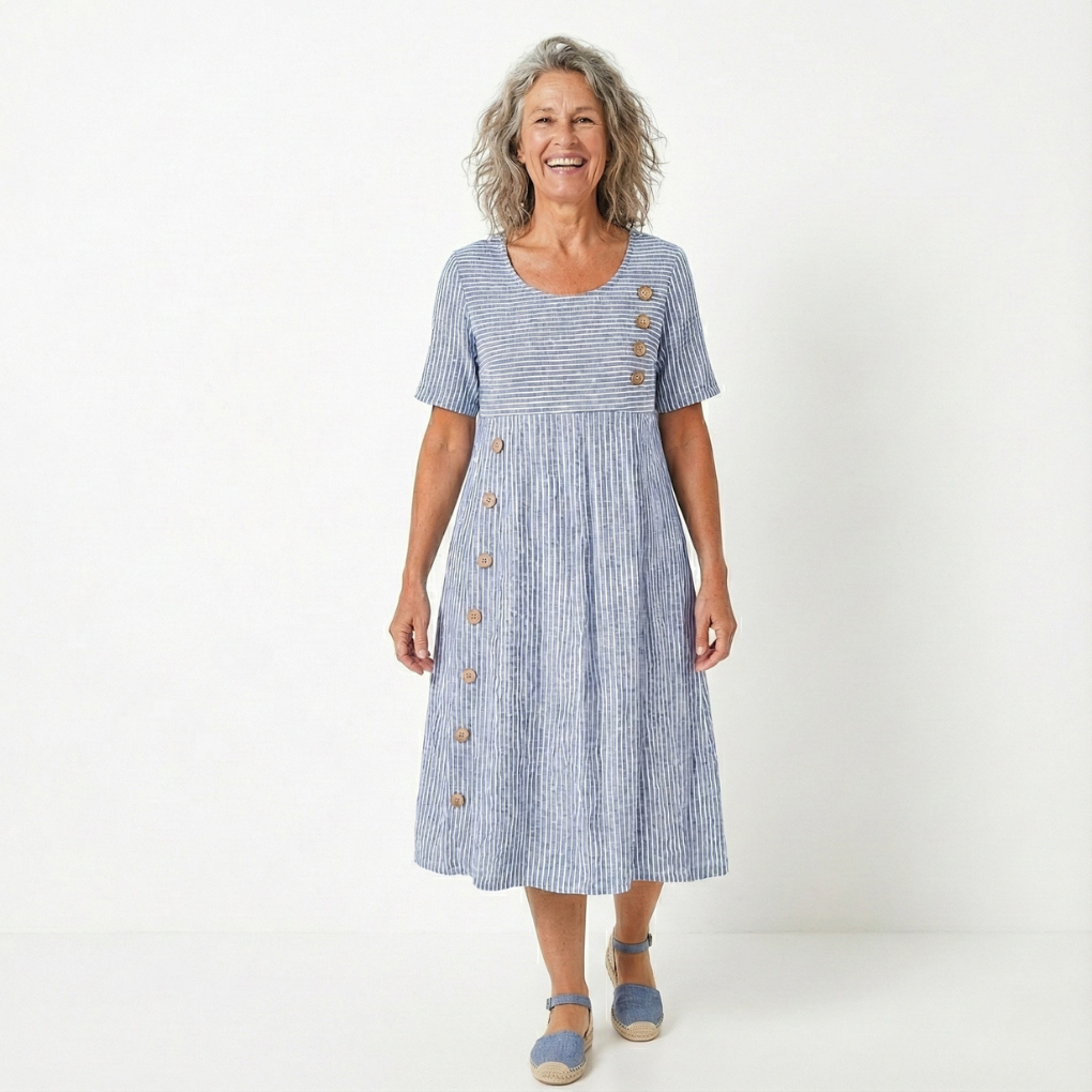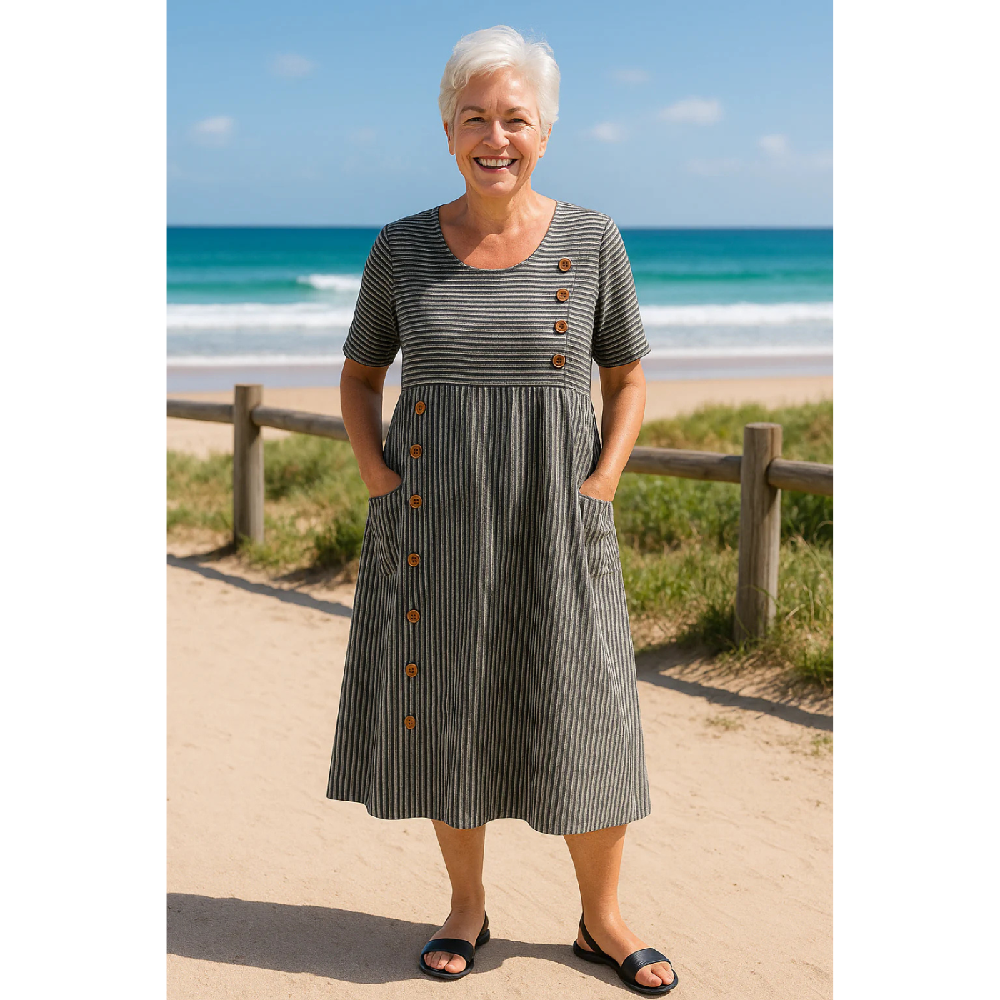 Decorative buttons add a touch of classic style, while the handy side pockets make it wonderfully practical. Effortless to wear, easy to style Nora is made for real life and sunny days.